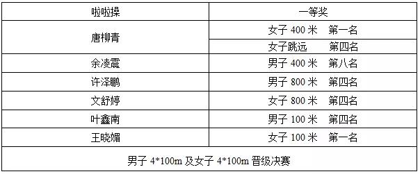 出战。其中唐柳青同学赢得女子400米第一名及女子跳远第四名,余凌震同学获得男子400米第八名。